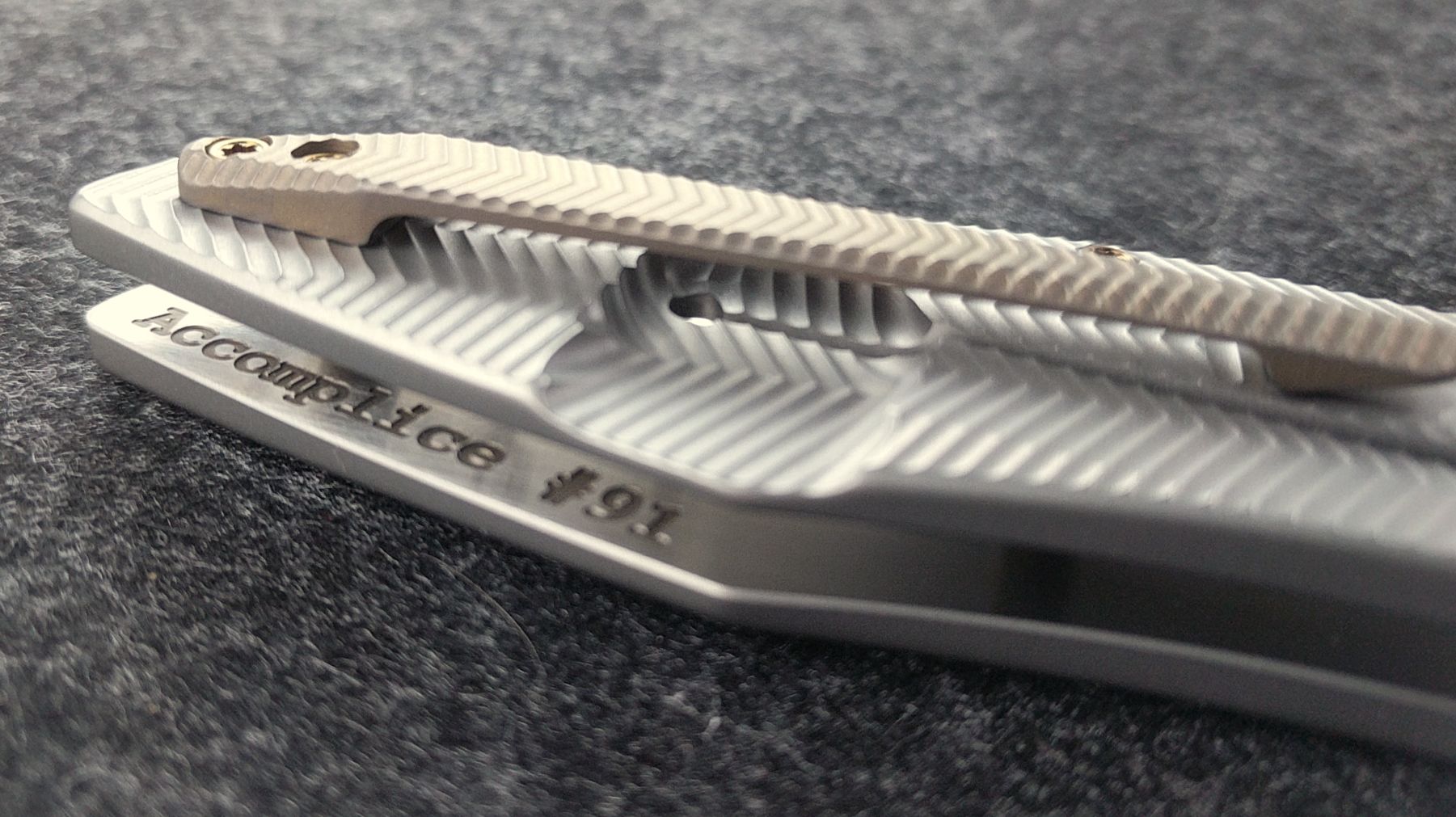 Our classic Accomplice design has been upgraded with a modern 3D machined handle texture. Our signature extra large pivot discs and clips even get the 3D machined treatment to match the handles. All of this machining creates an eye catching knife that feels amazing in the hand.