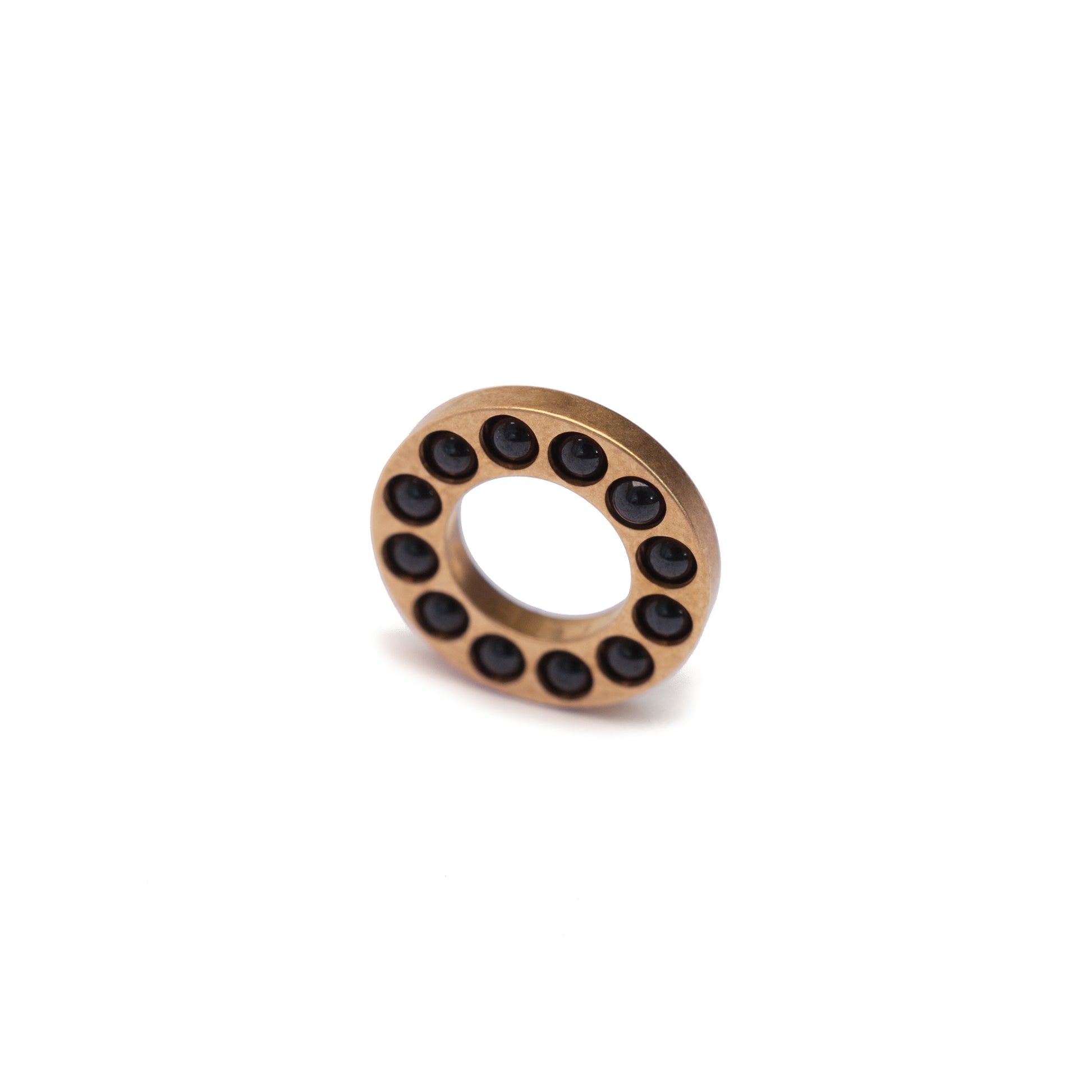 Cage bearings that allow more balls to be placed around the knife pivot than standard cage bearings. Which provides more support for the blade and decreasing stress on each ball. The ceramic balls are captured in the disc but are still free floating to prevent binding.