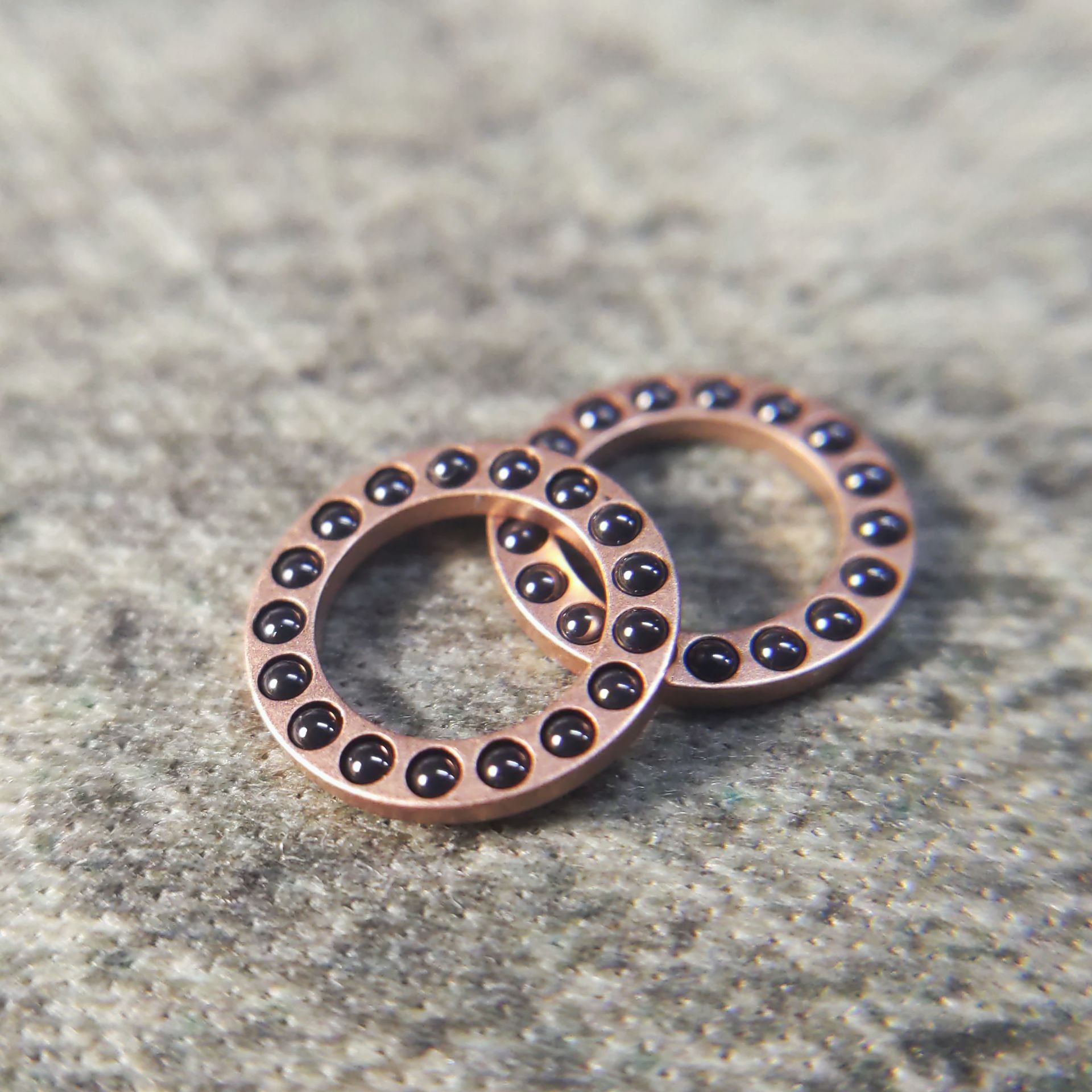 Cage bearings that allow more balls to be placed around the knife pivot than standard cage bearings. Which provides more support for the blade and decreasing stress on each ball. The ceramic balls are captured in the disc but are still free floating to prevent binding.
