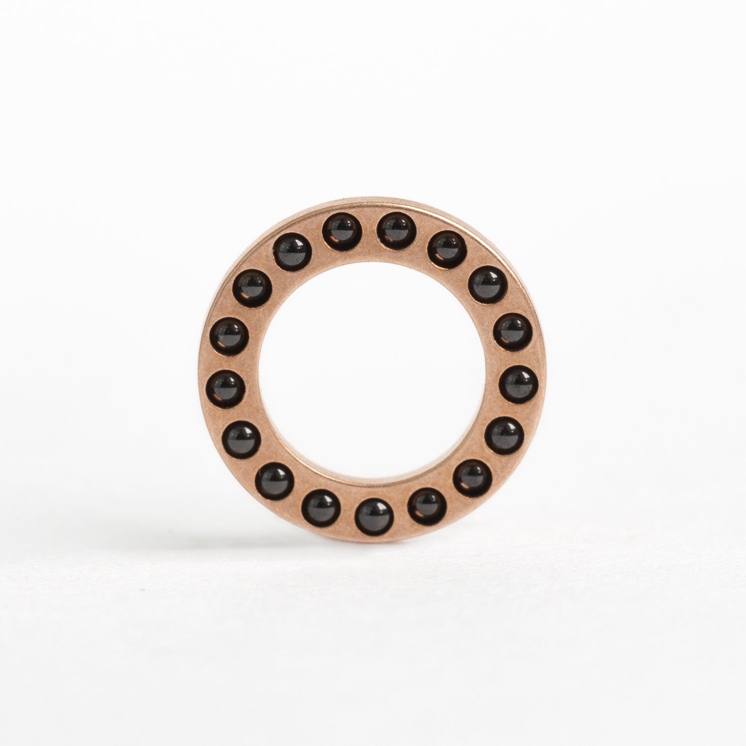 Cage bearings that allow more balls to be placed around the knife pivot than standard cage bearings. Which provides more support for the blade and decreasing stress on each ball. The ceramic balls are captured in the disc but are still free floating to prevent binding.